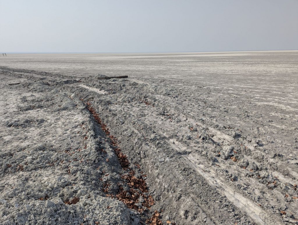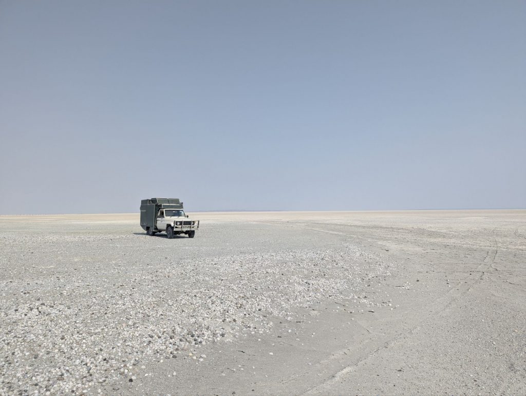 In the morning when I got up it was about 20C. I have to wait until I get enough sunlight on the solar panels before I can turn on the starlink. My two AGM batteries, now nearly 7 years old are just not much good any more. I packed up and headed out. It was back the way I came 10km across the pan until I turn south. I noticed just as I got to the pan tracks of someone who had driven maybe 10m off the main track, and had got terribly bogged. I met a car coming the other way crossing the pan.