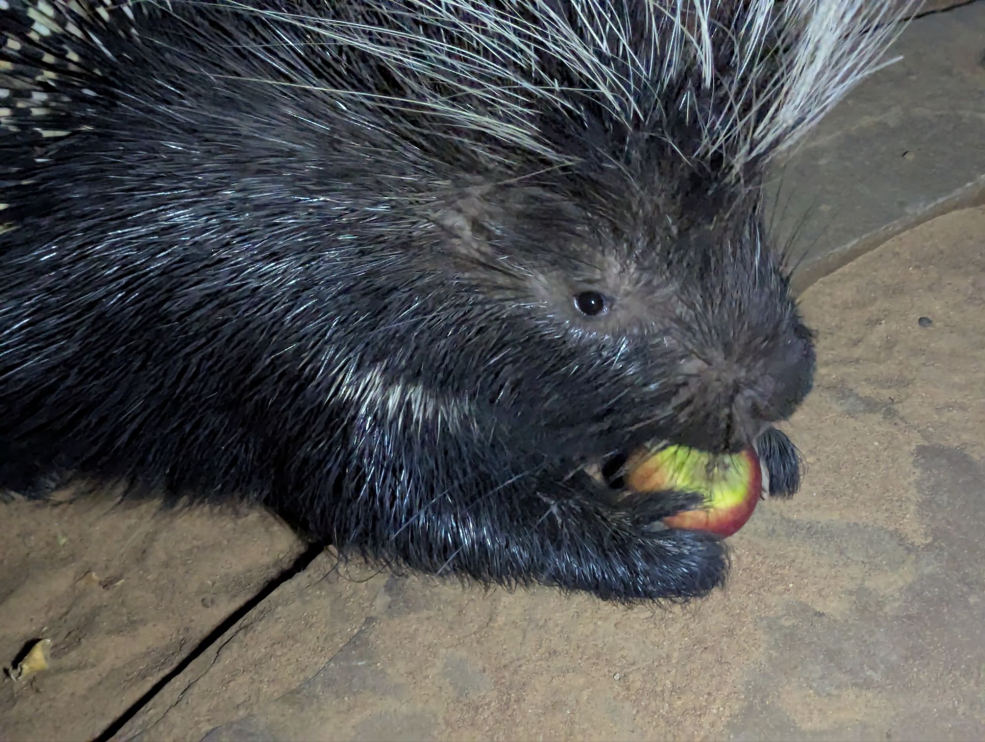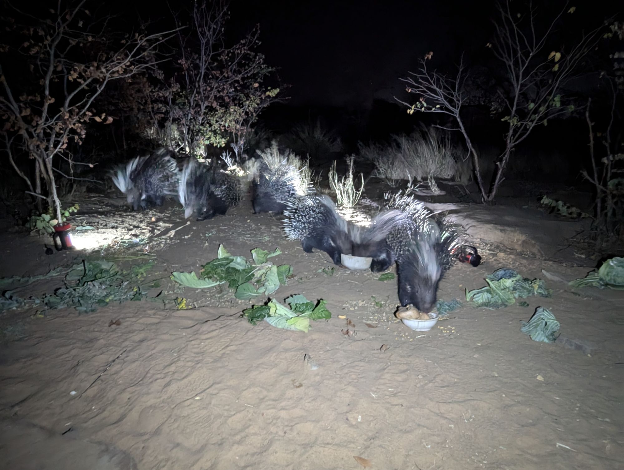Later in the evening James takes me to the enclosure to feed the porcupines. I had never seen porcupines (they are nocturnal so that’s possibly one reason). They have six in an enclosure. We spent an hour feeding them, cabbage, apples. They are so tame that you can hand feed them apples. They are sort of scary looking, but quite friendly.